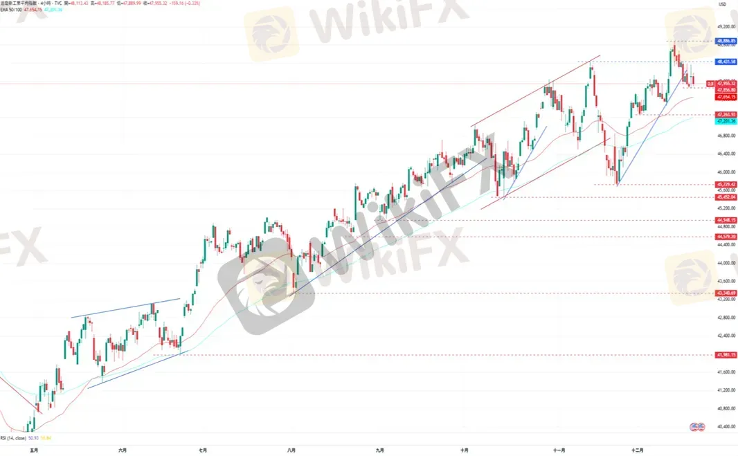 道琼指数保持在47856点上方波动,目前的走势维持中性,若是进一步跌破EMA50与47462的低点,价格将转向看跌。下跌方面,道琼指数目前的支撑为12月10日的低点47462点,接着为12月2日的低点47263点。上涨方面,道琼指数目前的阻力为12月17日的高点48387点,再来是12月12日的高点48886点。