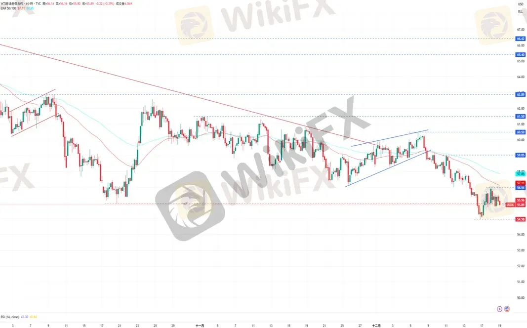 CPT Markets分析师指出,WTI原油保持在57美元下方波动,由于价格保持在EMA50均线下方,因此原油目前的前景仍偏向看跌。下跌方面,WTI原油目前的支撑为12月16日的低点54.98美元。上涨方面,WTI原油目前的阻力为12月17日的高点16.98美元,再来是12月10日的高点59.05美元。