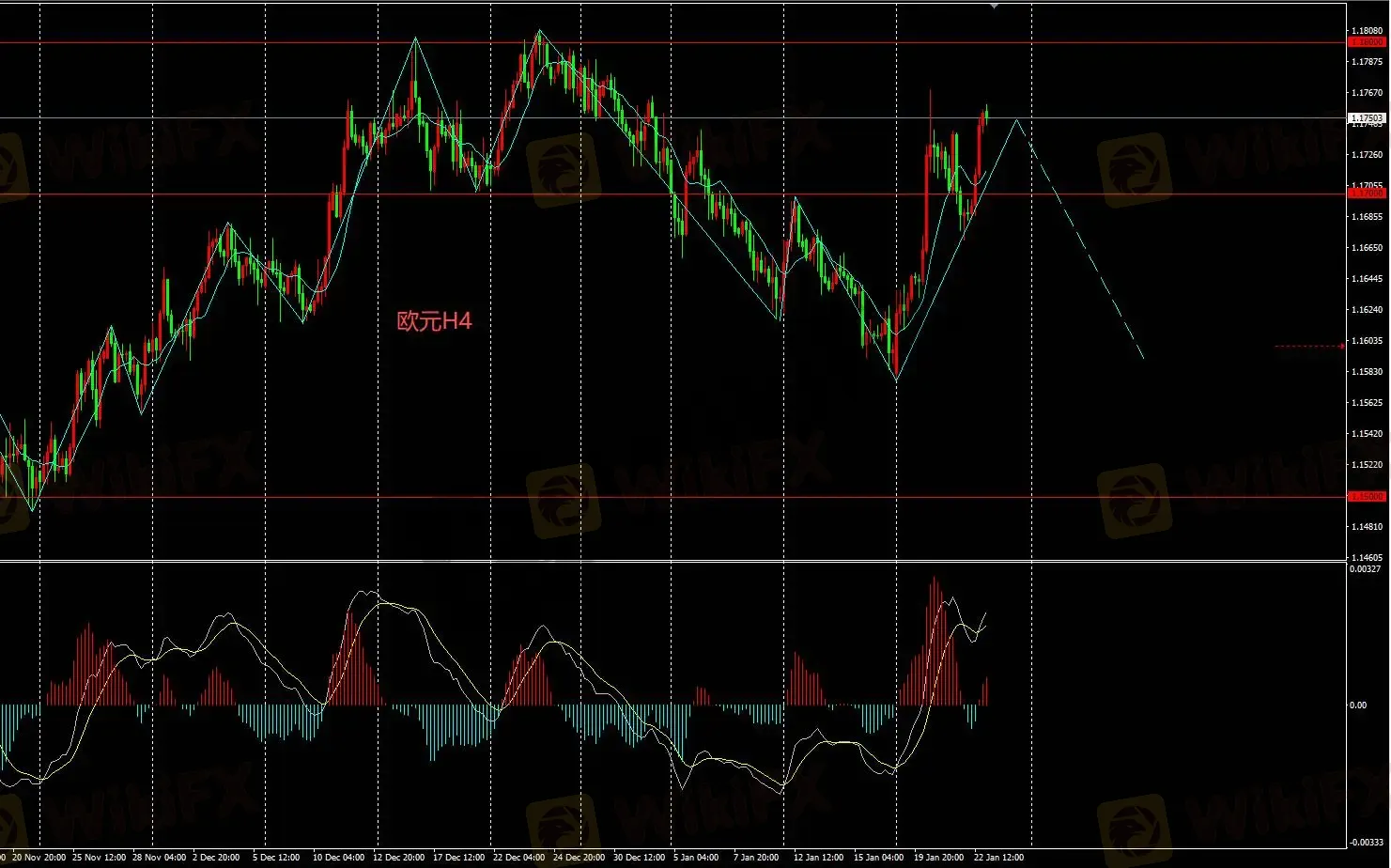 H4图表价格只要汇价维持在1.17关口上方持续跟踪,不可盲目入场做空;此次强势回调必须待价格下破1.17后才可介入。