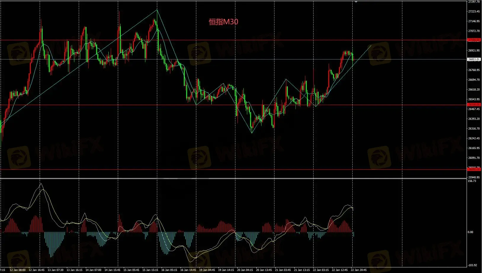 恒指M30当前持续看多,逢低买入策略;看多至27000及27500。