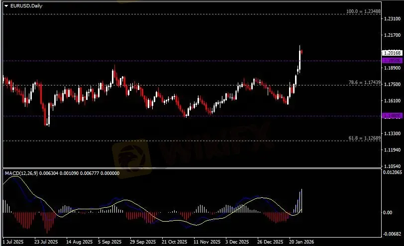 日线图显示欧元兑美元震荡走强,当前收于前期阻力区域1.1950。从MACD来看,快慢线向上扩张,白色动能柱持续放量。汇价走势基本和动能柱的变化一致。