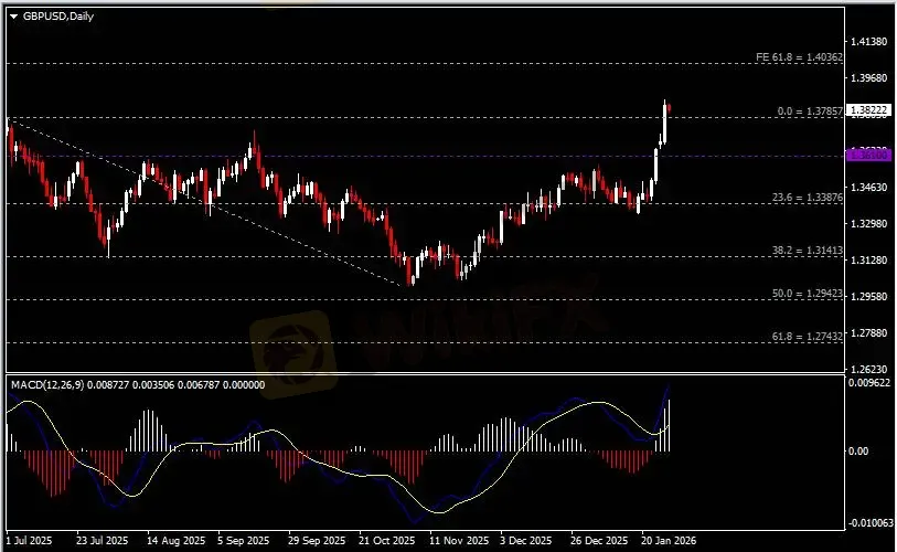 日线图显示英镑兑美元震荡上行,当前收于前高1.3790。从MACD来看,快慢线向上运行,白色动能柱持续放量。汇价走势基本和动能柱的变化一致。