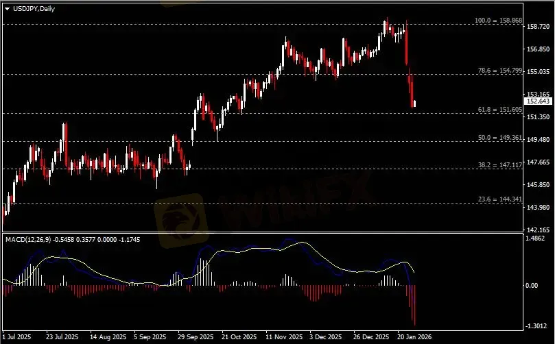 日线图显示美元兑日元震荡下挫,当前承压于154.80阻力。从MACD来看,快慢线向下扩张,红色动能柱持续放量。汇价走势基本和动能柱的变化一致。
