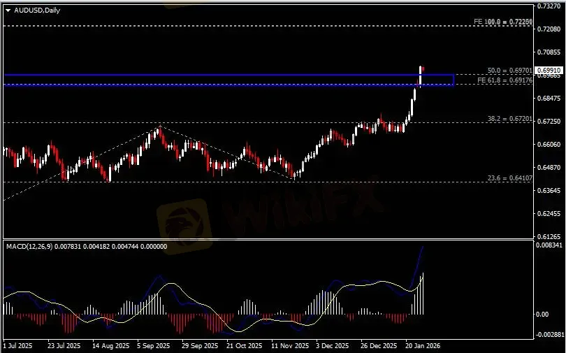 日线图显示澳元兑美元震荡走强,当前收于前期阻力区域0.6920-0.6970。从MACD来看,快慢线向上扩张,白色动能柱持续放量。汇价走势基本和动能柱的变化一致。