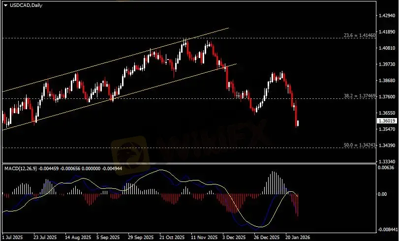 日线图显示美元兑加元强势下挫,当前承压于1.3750阻力。从MACD来看,快慢线向下运行,红色动能柱持续放量。汇价走势基本和动能柱的变化一致。