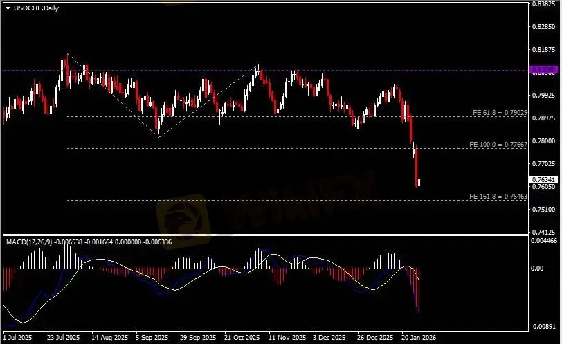 日线图显示美元兑瑞郎强势下挫,当前承压于0.7770阻力。从MACD来看,快慢线向下运行,红色动能柱持续放量。汇价走势基本和动能柱的变化一致。