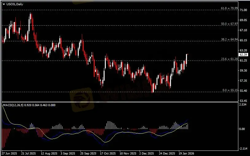 日线图显示纽元兑美元震荡上涨,当前逼近0.6060阻力。从MACD来看,快慢线向上运行,白色动能柱持续放量。汇价走势基本和动能柱的变化一致。