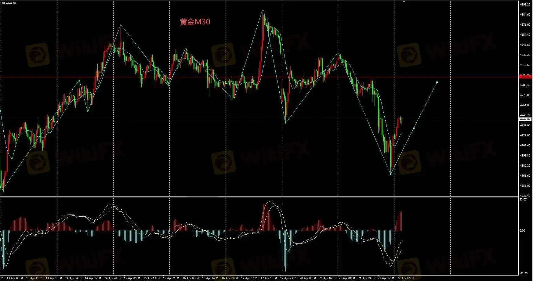 M30图表金价日内逢高卖出操作,重要关口4800,只要金价维持在该价位下方运行日内持续看空。