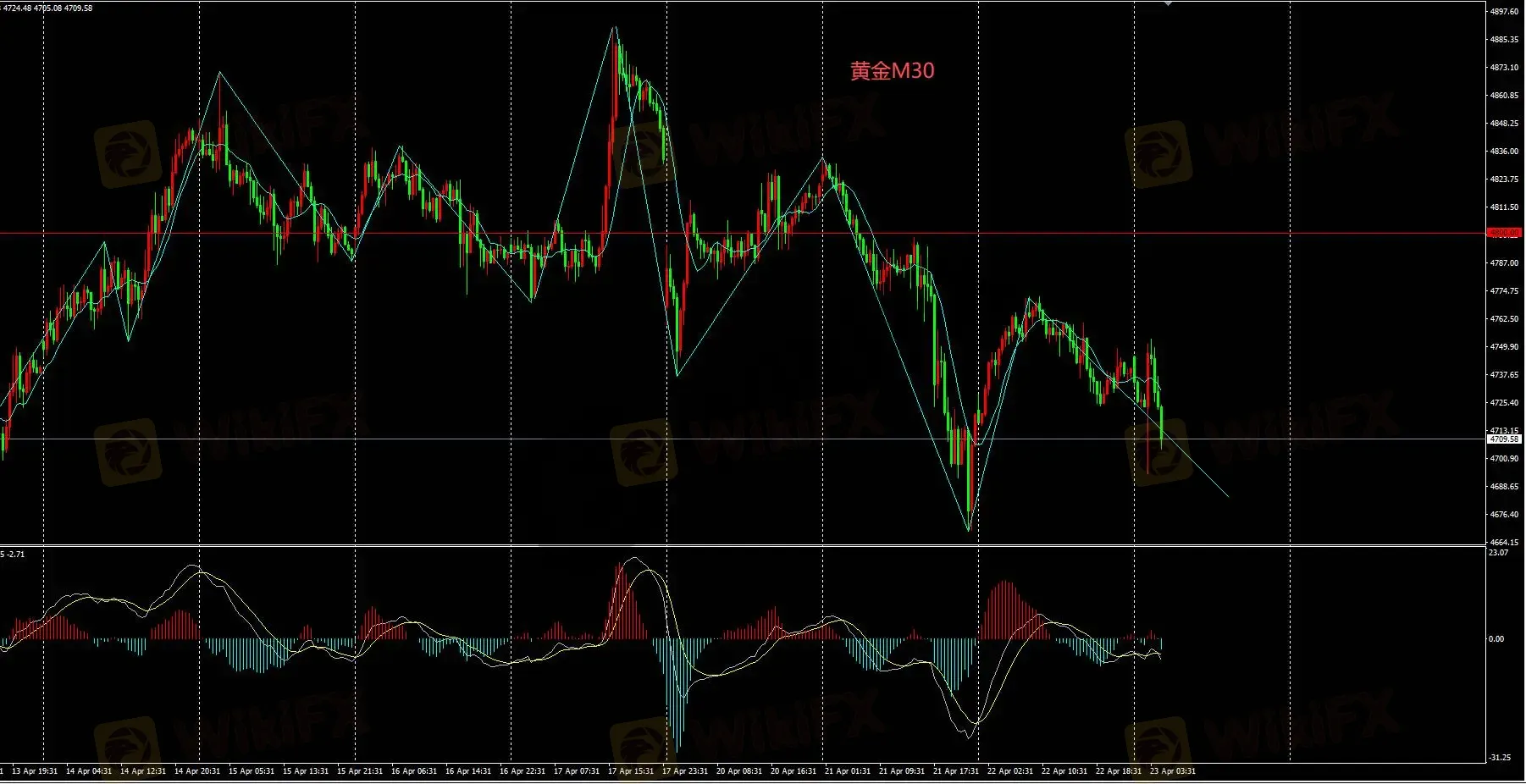 黄金价格昨日冲高后再次回落;跌至4700一线,短期看空。