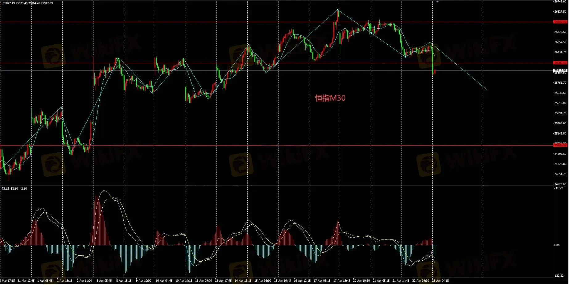 恒指M30多头当前一旦价格再次收复26000关口,则可轻仓入场做多,价格一旦跌破26000,则多头计划暂时搁置。