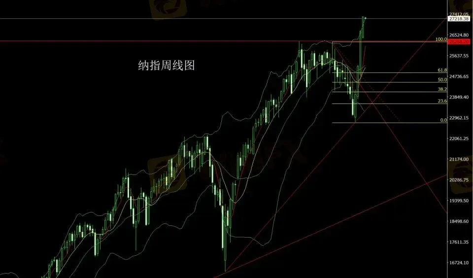 纳指市场上周低开在26418的位置后行情小幅回踩给出26370.12的位置后行情强势拉升,周线最高触及到了27321.57的位置后整理,周线最终收线在了27294.55的位置后,周线以一根基本饱和大阳线收线,而这样的形态收尾后,本周27000多止损26900,目标看27200和27300和27400和27500.