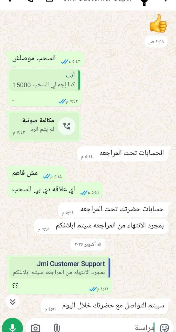 أودّ تقديم شكوى رسمية ضد شركة التداول JMI Brokers Ltd بعد إغلاق حسابي رقم 47706 واحتجاز أرباحي البالغة 15,000 دولار أمريكي دون أي مبرر قانوني.