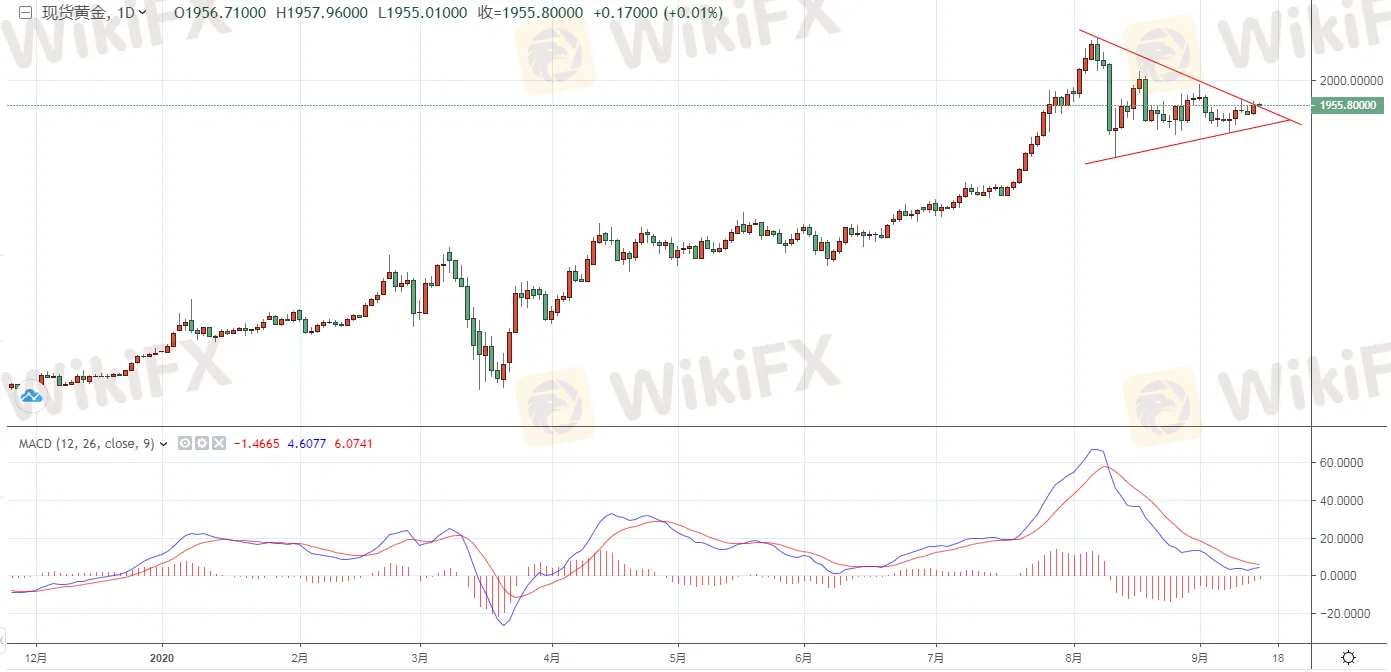 黃金方面,週二(9月15日)亞市早盤,現貨黃金維持窄幅震盪,目前金價暫報1956.49美元/盎司。由於市場預期美聯儲鴿派的可能性進一步增強,這無疑引發了市場對於避險黃金的需求,致使黃金上逼1960關口。