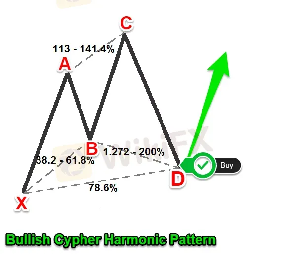 Cypher模式出現的頻率低於其他諧波圖案。這是因為市場價格很難滿足這種剛性斐波那契比率。
