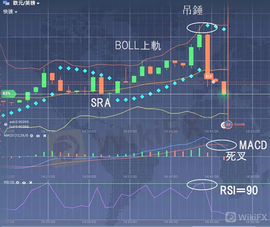 1、當匯價穿越上限壓力線時,布林線表現為賣點信號