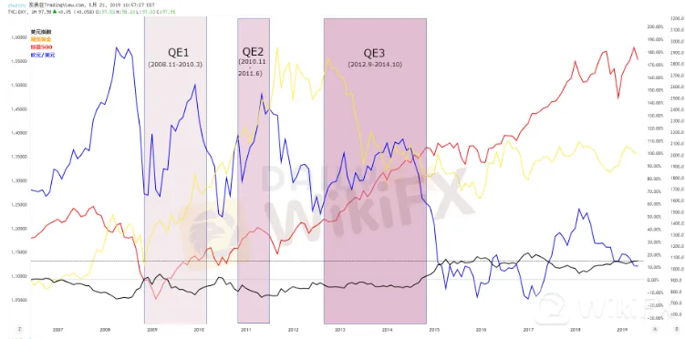 QE1階段中,美元指數(黑色)以下跌為主,現貨黃金(黃色)、標普500指數(紅色)和歐元/美元(藍色)則不同程度上漲,其中以標普500為代表的美股迅速從次貸危機的恐慌中恢復過來,在充足流動性保證下拉開十年牛市的帷幕,黃金與歐元則在美元貶值下展開新一輪波段上漲,外匯市場明顯加劇動蕩。