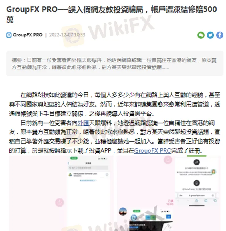 不久前,外匯天眼發布曝光GroupFX PRO的文章「誤入假網友教投資騙局,帳戶遭凍結慘賠500萬」,詳細介紹了這個黑平台透過社交平台實行假投資詐騙的手法,並呼籲所有投資人遠離這家交易商。由於目前持續有受害者前來投訴,今天我們將繼續揭露其惡行。