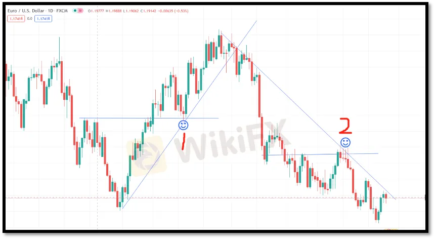 我們先做1號波段點的水準支撐阻力位以及向上趨勢線。在笑臉處尋找進場位。