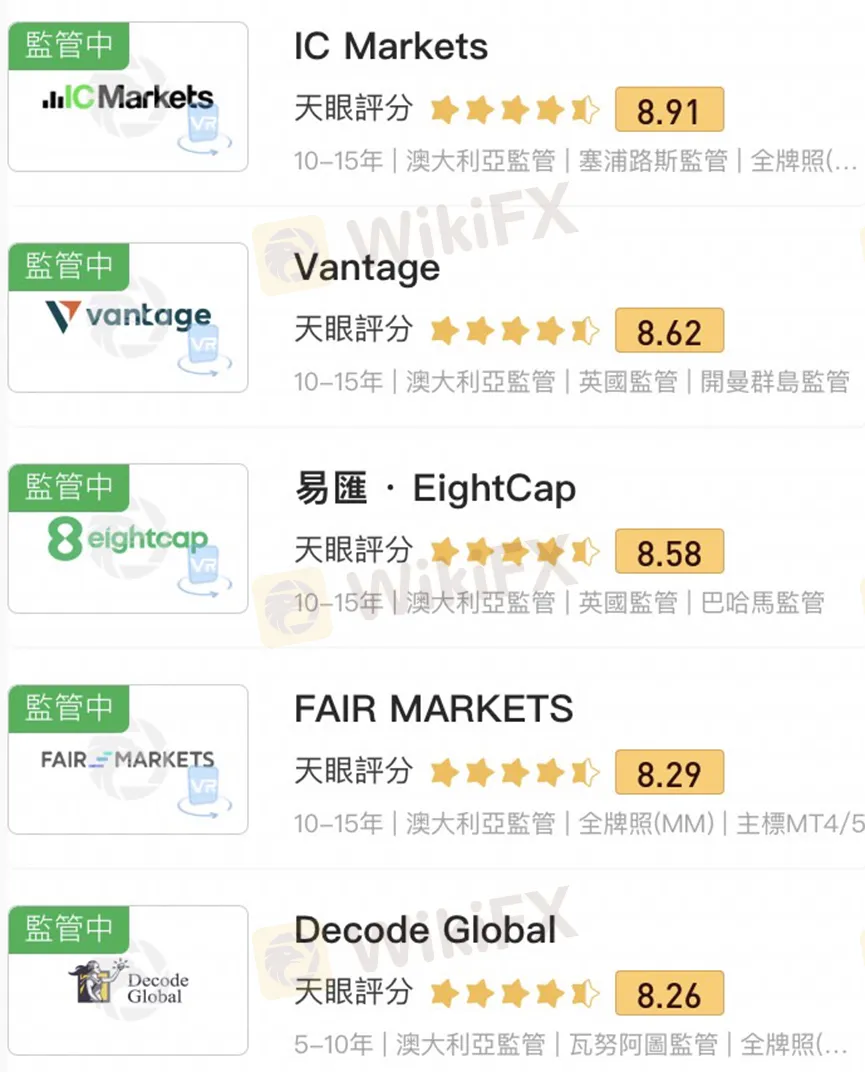 在外匯天眼APP裡查詢Decode Global,可以看到是成立5-10年的交易商,雖然時間較前面幾家平台短,但也是使用主標MT4/5軟體,受到瓦努阿圖VFSC離岸監管,並且有澳洲ASIC全牌照,提供EMC100%回覆、與IAP法律援助服務。