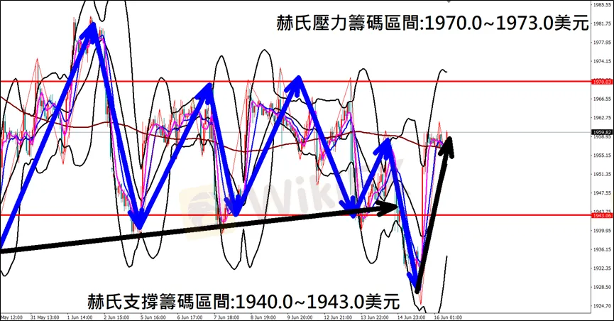 今日(6月16日)黃金早盤在1957.1美元/盎司附近,從技術分析面切入,1小時級別觀察黃金走勢,符合昨日(15日)預測K棒盤中持續下跌,隨後出現報復性反彈,目前K棒來到上方壓力區間,因此建議外匯市場投資人,今日黃金操作心態以偏空看法為主。