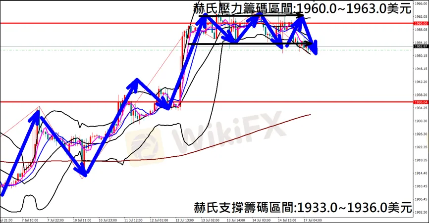 今日(7月17日)黃金早盤在1954.5美元/盎司附近,從技術分析面切入,1小時級別觀察黃金走勢,上週五(14日)K棒高點狹幅震盪後拉回修正,目前K棒落在中軌壓力下方,同時開口轉折朝下,有望持續向下修正,因此建議外匯市場投資人,今日黃金操作心態持續以偏空看法為主。