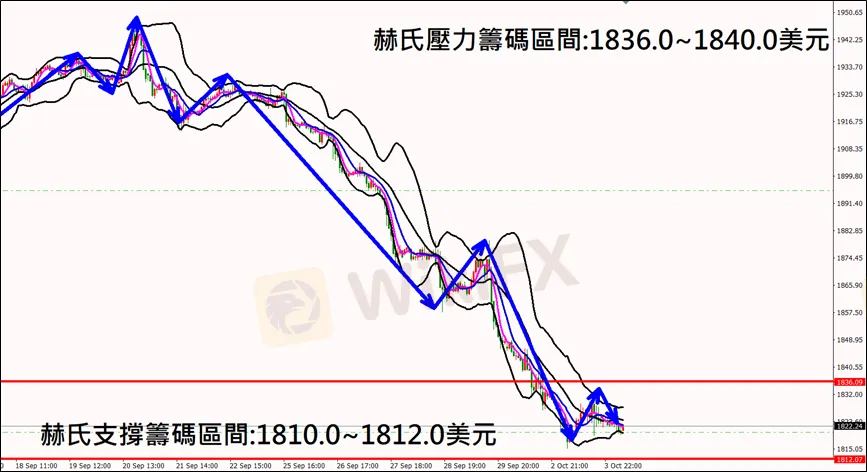 今日(10月4日)黃金早盤在1822.6美元/盎司附近,從技術分析面切入,1小時級別觀察黃金走勢昨日(3日)跌深後落在低點震盪,隨時都破底可能性,目前K棒受到中軌壓力,因此建議外匯市場投資人,今日黃金操作心態嘗試以偏空看法為主。