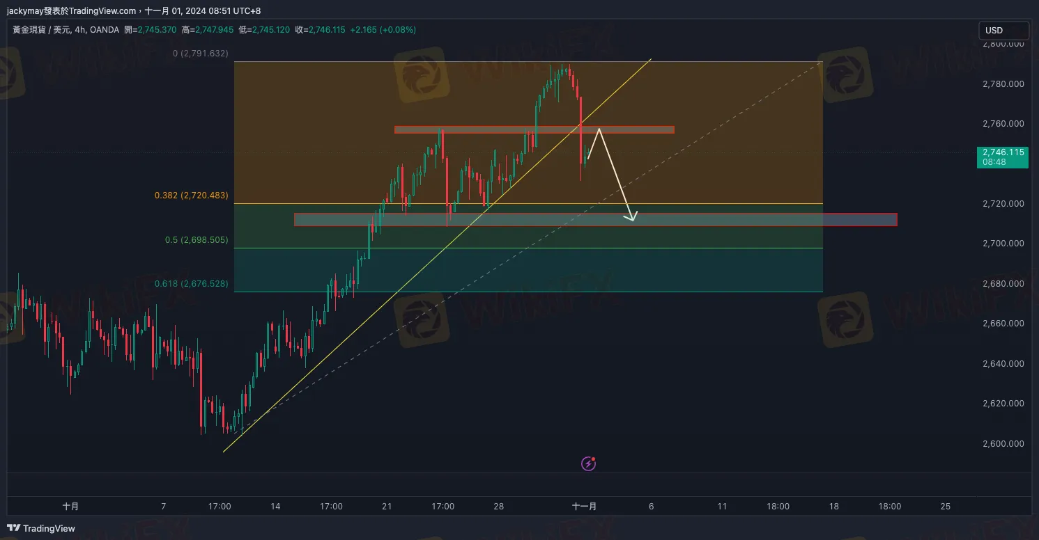 昨晚黃金4小時級別大跌,從技術分析的角度來看跌破了上升趨勢線與前個阻力區域